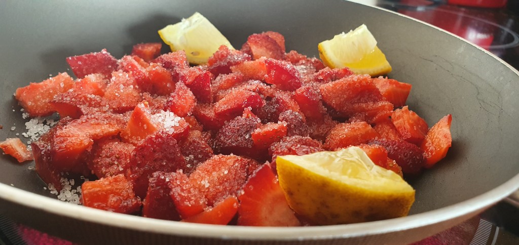 ΓΙΑ ΤΟ ΓΛΥΚΟ ΦΡΑΟΥΛΑΣ:Κοβουμε τις φραουλες μας σε μικρα κομματια και τις βαζουμε σε ενα τηγανι μαζι με τη ζαχαρη,το νερακι και το λεμονι κομμενο στα 4.Αφηνουμε να βρασει για 10 λεπτα και μετα το αφηνουμε να κρυωσει για να το χρησιμοποιησουμε.