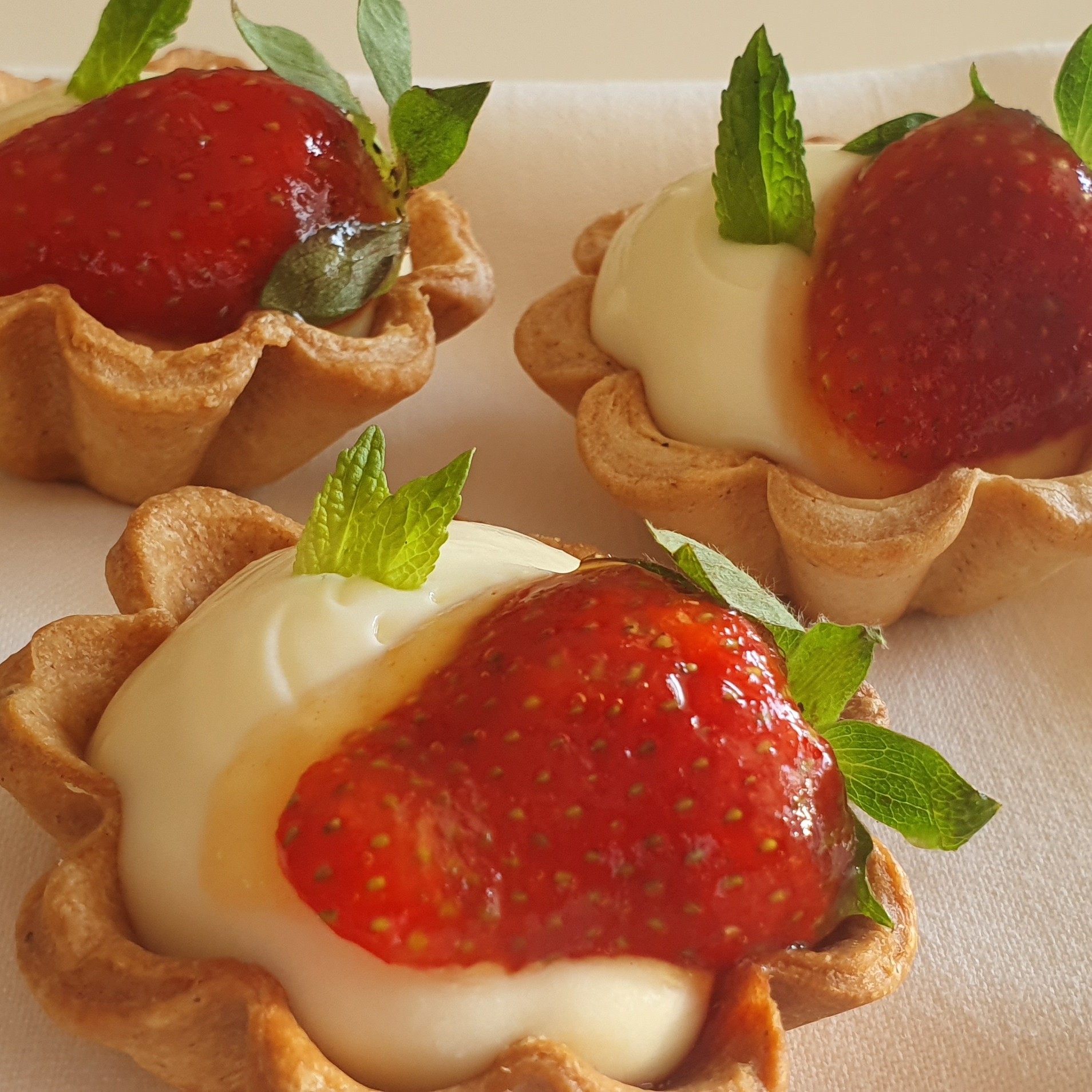 Τοποθετουμε μεσα στη ταρτα μας πρωτα το γλυκο φραουλα και επειτα τη κρεμα μας.Αν ειναι μεγαλη ταρτα μπορουμε να απλωσουμε τη κρεμα.Ενω αν ειναι ταρτακια μπορουμε να βαλουμε τη κρεμα σε μια σακουλα ζαχαροπλαστικης και να την γαρνιρουμε με υψος και κυκλικο σχημα.Συνεχιζουμε με τις φρεσκιες φραουλες τι οποιες θα τις βουτηξουμε μεσα στο ζελε πορτοκαλι-λεμονι..Και θα σας μαγεψει η γευση τους..Τελειωνουμε την ταρτα μας με φρεσκο δυοσμο.